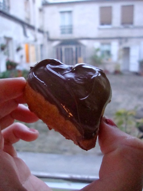 Any other time I have eaten a donut, I have been disappointed by their dryness and have been left feeling predictably sick to my stomach. (Although Nopa once served these incredible, warm sugar-dusted donut holes alongside caramel sauce, and I’m a huge sucker for churros at the zoo, and I have been known to like Tim Horton’s chocolate donut holes, and I also tried deep-fried Oreos at the Italian Street Festival in NYC and will admit to liking them). I can’t say, with this challenge, that my opinion of donuts has changed all that dramatically. I stirred, I kneaded, I battled to the death with sticky dough, I tried it twice, I deep fried, I sugar dusted, I Nutella iced, I ate a couple, and then I wowed my French co-workers, who eagerly took them all off my hands to eat alongside the morning’s French-pressed espressos. The outside was a bit crunchier than I would have liked and the inside could have been a bit fluffier; maybe I’ll try making them again when I am home and not cursing the 12 inches of counter space I have here, but honestly donuts are not high on my to-bake list.