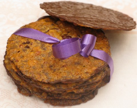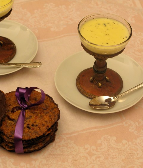 The February 2011 Daring Bakers’ challenge was hosted by Mallory from A Sofa in the Kitchen. She chose to challenge everyone to make Panna Cotta from a Giada De Laurentiis recipe and Nestle Florentine Cookies. I actually used a recipe from Joy of Cooking for the florentines, as I thought an almond version looked more traditional that one using rolled oats.