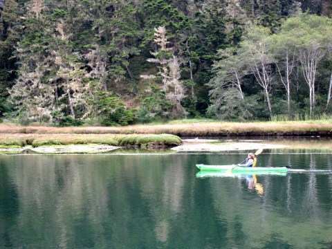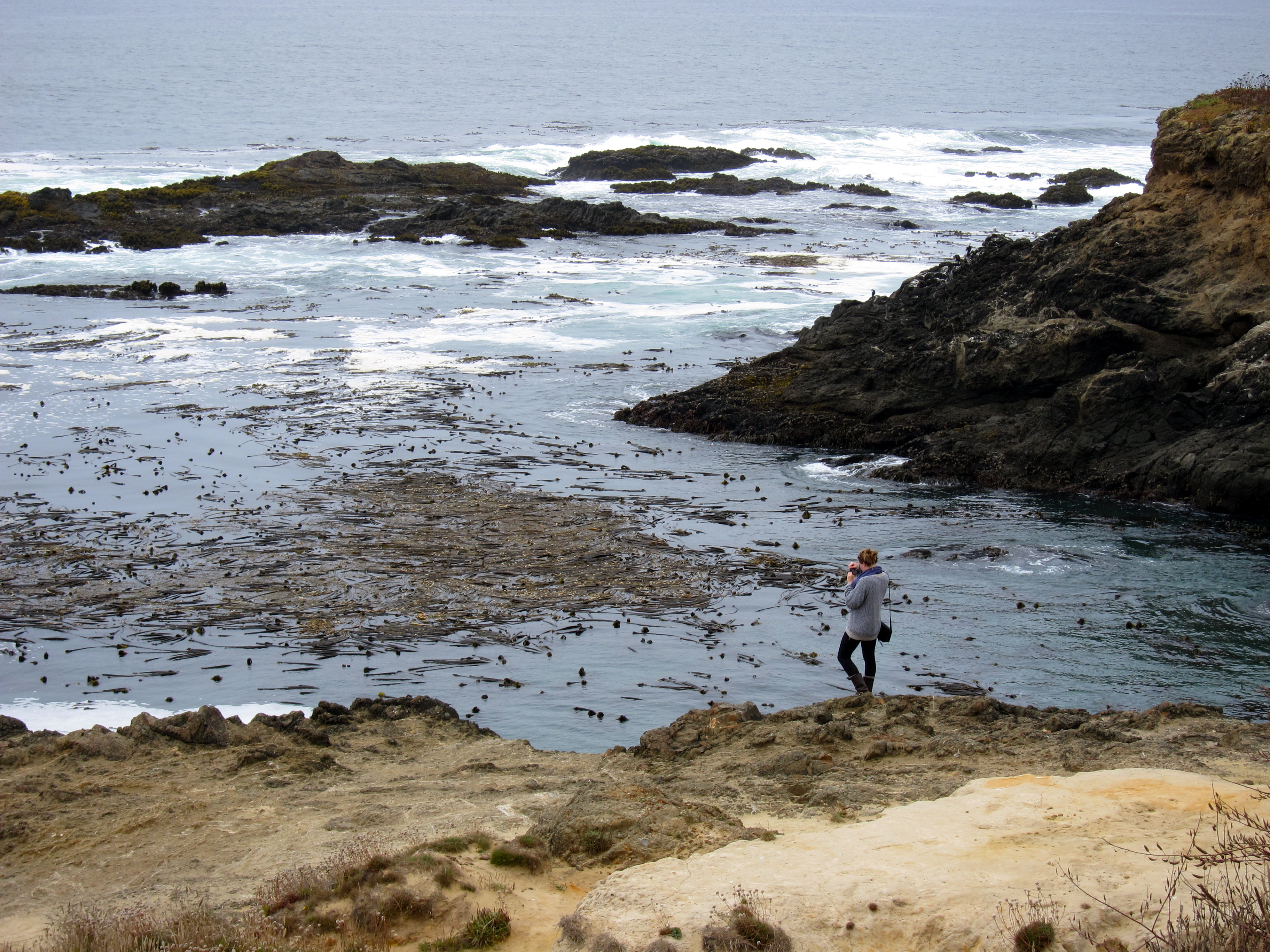 It was an impromptu trip of sorts (in fact, we booked the hotel room when we were already a good hour outside of the city), fashioned after a week of failed searching for an available campsite in Big Sur. We didn’t pack any special treats for the car trip and didn’t stop at any renowned restaurants. Instead we sampled beer at the Ukiah Brewing Company, tasting the difference between light and dark brews, beer made with wild flowers and made with hops (which was particularly interesting after the article I wrote about hops). We inspected a forty-year-old woman’s dreadlocks hanging down to her waist from a nearby table at the Mendocino Café, which seemed a bit confused about which ethnic cuisine it was trying to emulate — Thai burritos, nachos piled high with guacamole, Brazilian seafood stew and Indian-style curry. At nightfall, run-down hippies with long hair sat on the sidewalk, nursing beer bottles; they would still be there the next morning, peddling scraps and jewelry. We sat by the fire in our room at the Inn and ate waffles made with kamut and oat flour for breakfast at the Inn’s vegetarian and vegan restaurant. A seal glided up beside my kayak in the glassy water that morning and a walk down the highway to the shore saw swelling waves breaking on black rocks covered in moss and slimy green plants that looked like miniature palm trees. Then, we joined the long line for morning coffee and piled back in the car for the drive home.