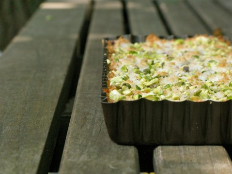 Preheat the oven to 350 degrees F. Butter your tart pan of choice. The original recipe uses an 8 by 11 inch tart pan but I did just fine with my long, rectangular pan.