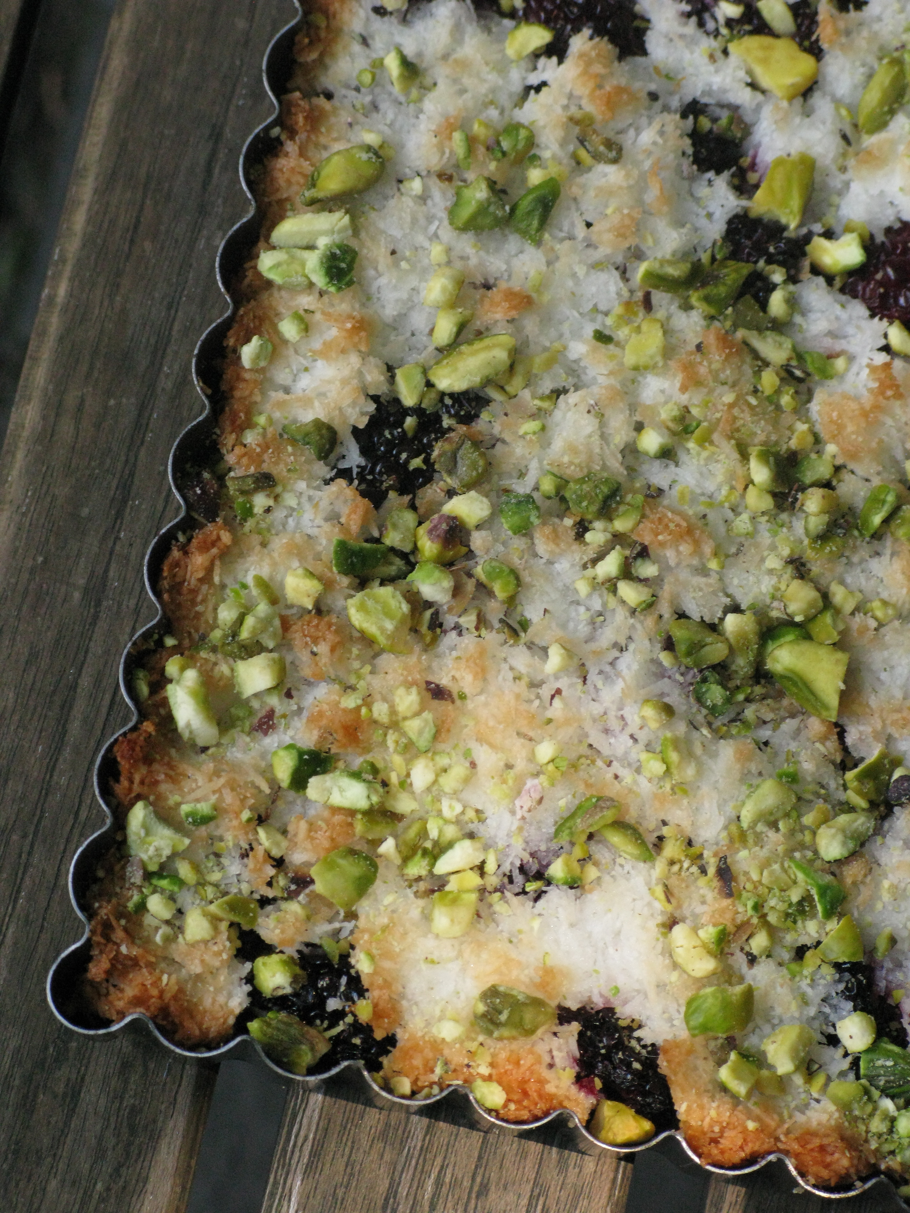 Baked, they meld into tart, jammy pockets beneath chewy flakes of coconut. They soak into a thick shortbread crust, gently teasing out the natural sweetness of the browned-butter. The bars are finished with a colorful flourish of pistachios. And suddenly those blackberries, so wholly disappointing, are once again transformed into showstoppers, just in time for the end of summer.
