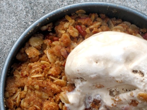Crisps were one of the very first things I made in the kitchen, if you exclude the concoctions of shaved chocolate and milk I used to love when I was four-years-old. Every so often, I would pull my only cookbook of my very own, Fanny at Chez Panisse, from the shelf and make a fruit crisp, sometimes doubling the topping to make sure there was enough. Sometimes enough wasn’t enough and I remained unsatisfied with a 2:1 topping to fruit ratio. Nowadays, I go by look and feel for the topping. I use my hands and throw ingredients around, a method that tends to work out well in the dorm kitchens, which are just barely stocked enough to be functional.