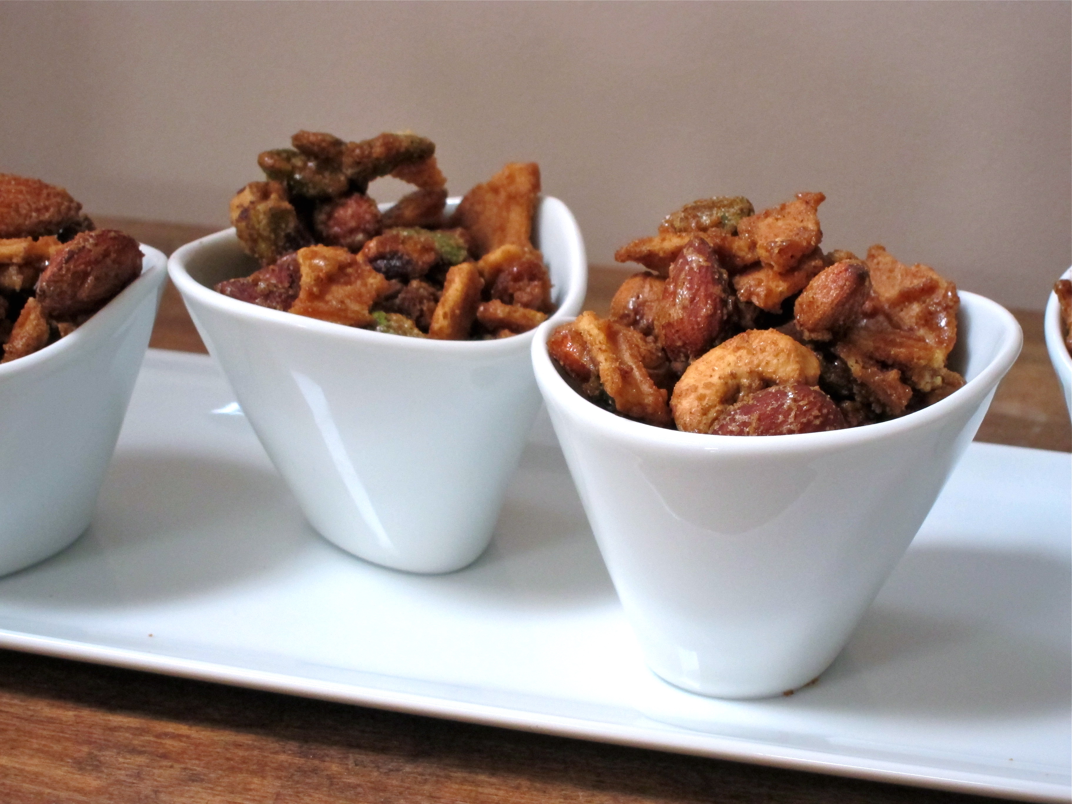Spread out the nuts on a baking sheet and roast for 10 minutes at 350 degrees F, flipping once. In a mixing bowl, stir together the browned, melted butter, brown sugar, cinnamon, chili pepper and maple syrup. Once the nuts are toasted, add them to the liquid sugar mixture and stir until they are completely coated. Stir in the salt. Then mix in the cookie pieces or pretzels. Spread the nut mixture back on the baking sheet and roast for 12-18 minutes, flipping or shaking every couple of minutes to ensure even toasting and that the sugar is not clumping. Remove the tray from the oven and let cool completely.
