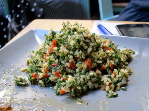 The best citrusy tabouleh I have ever had, served with a row of freshly fried, salty sardines.