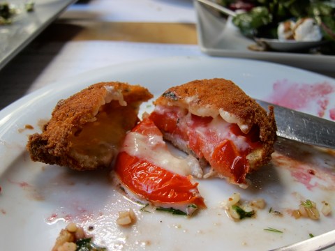 Zucchini very thinly sliced and flash fried. Crispy, crackly, and served with tzatziki yogurt for dipping.