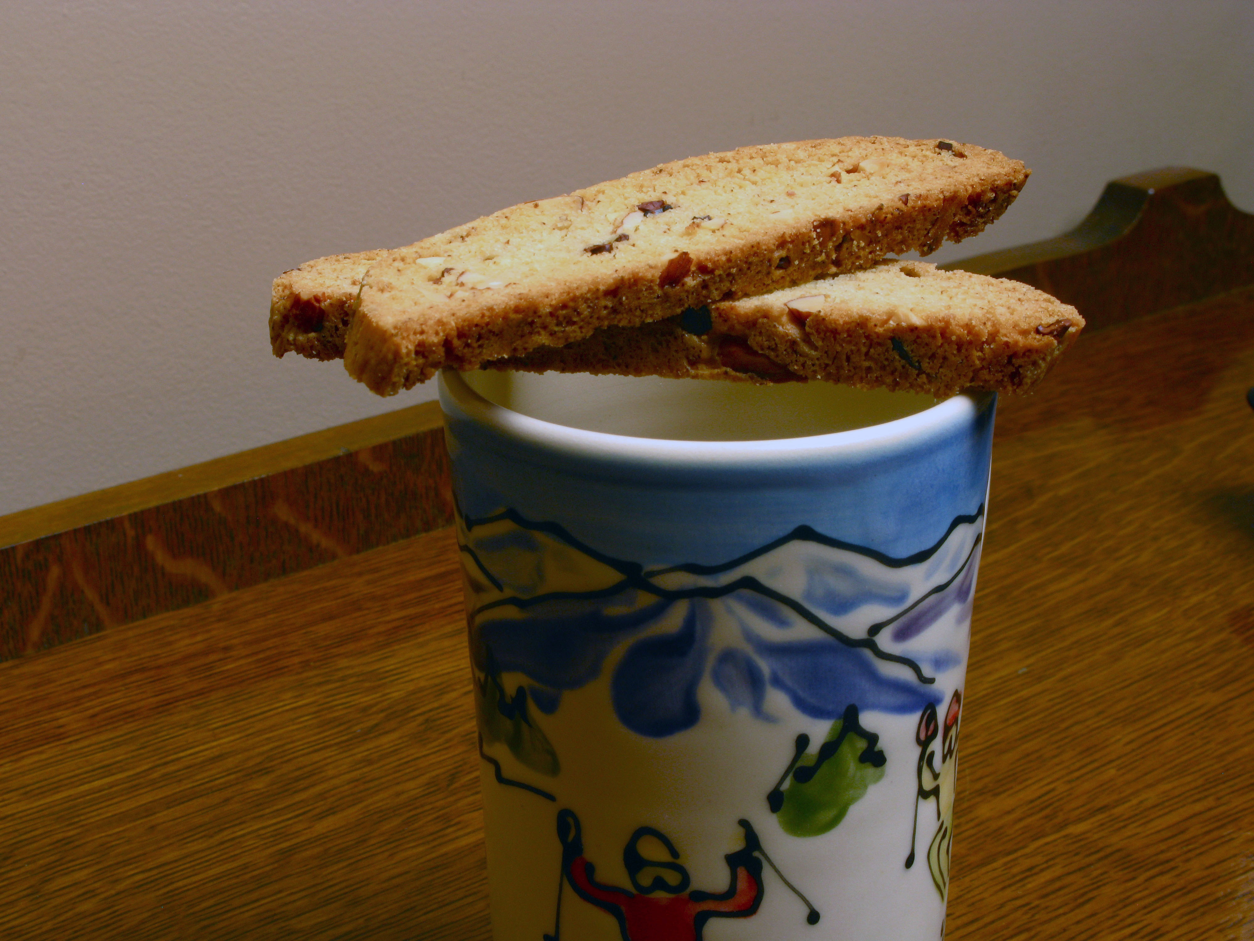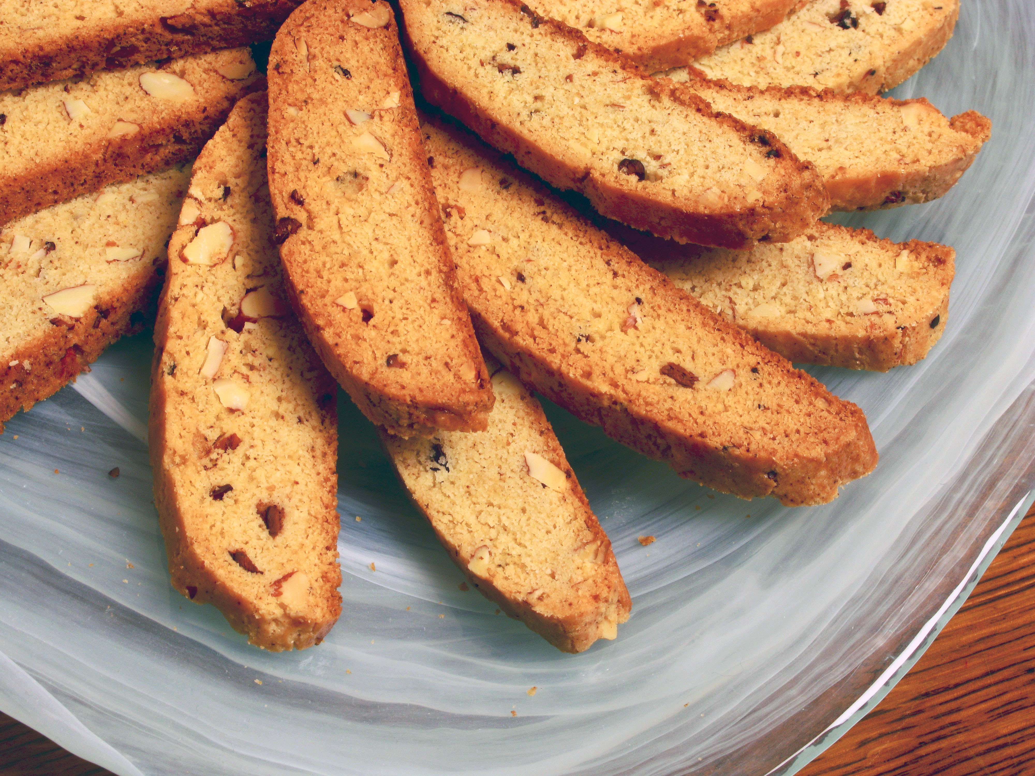 On the subject of the cookies. I packed half of them up in a box, and put the rest of them out at the end of a little neighborhood cocktail party the night before winter break ended. They’re studded with a delightful little chocolately crunch, without the sweetness of chocolate chips; twice baked (obviously); delicately flavored with both almond extract and chopped almonds; and so, so easy, it makes me wonder why people are so impressed by homemade biscotti. If only they knew, there would be so much less hate for the cookie which generally grows stale in the glass jar at your neighborhood coffee shop.