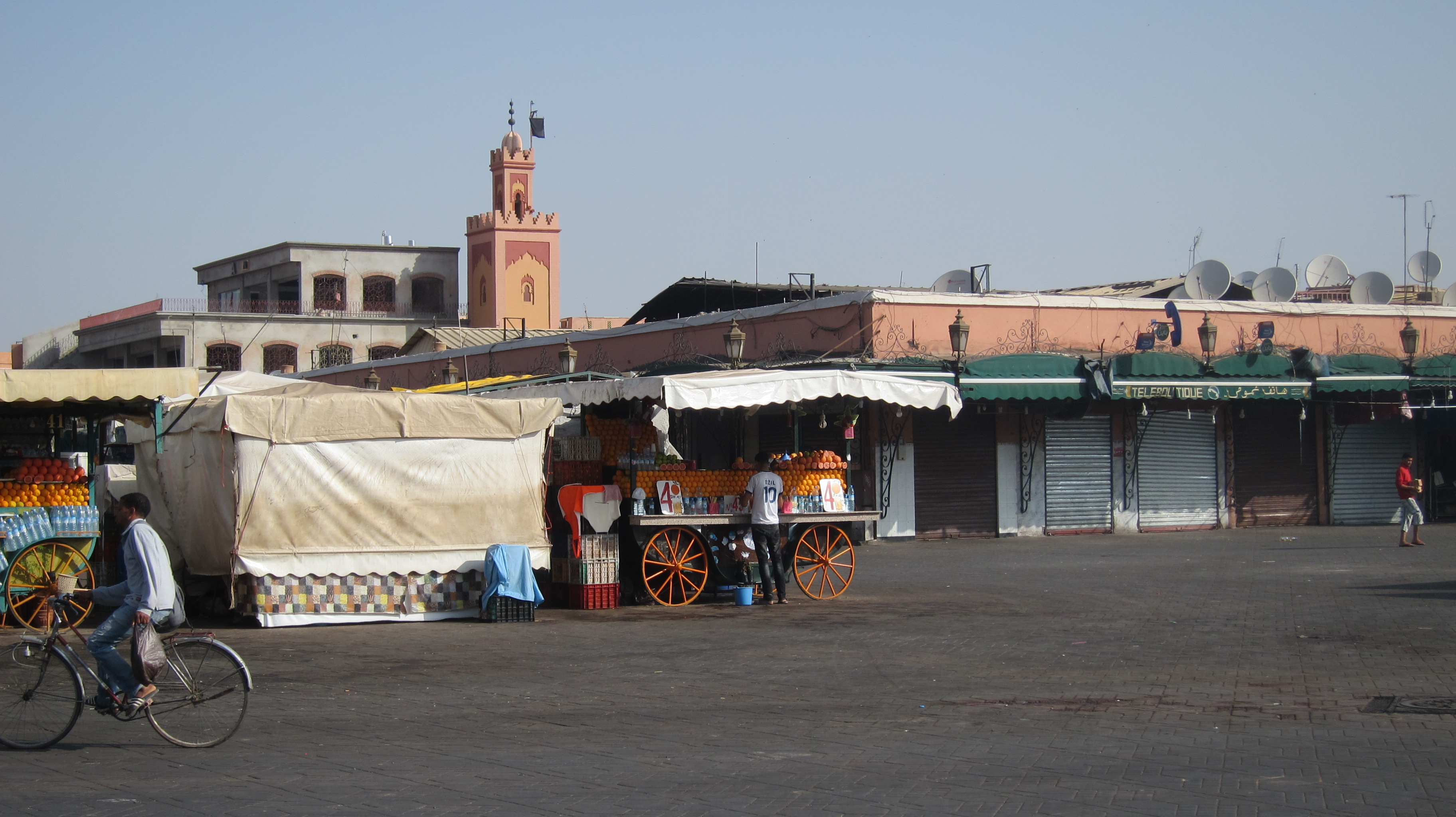 The call to prayer begins at 4:30 a.m., a sudden awakening from exhausted sleep by a vaguely monotone voice over the loudspeaker, originating from the mosque rising above the roofs of the old medina, just a couple of buildings over. It lasts about ten minutes, in which we lay, in the darkness of our room, in silence, waiting it out before sinking back into sleep. Outside, shopkeepers might already be making their way to their daily posts, a small cafe selling miniature honeyed almond confections, or maybe a fresh-squeezed orange juice stand in the market square, Djemaa El Fna. By 8 a.m., we’re slinking out of our room at the top floor of the Riad Marrakiss, down two staircases to a pot of coffee and some bread with jam.
